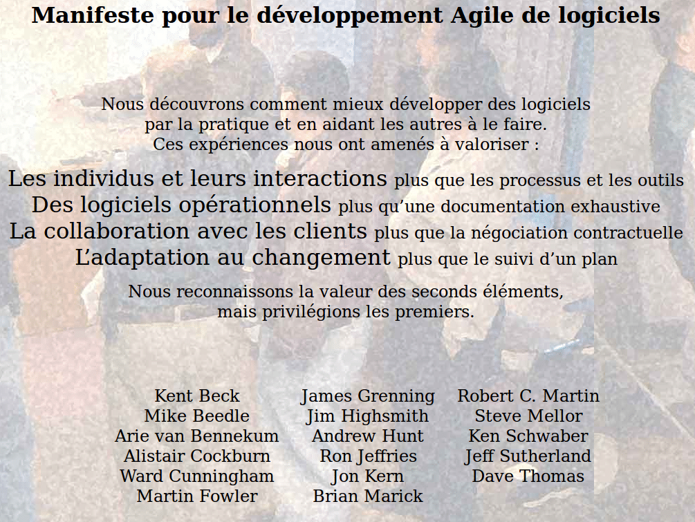 Juste avant la publication du Manifeste Agile, certains des participants qui ont conçu le document, notamment Kent Beck, ont présenté au monde la méthodologie de développement logiciel appelée Programmation Extrême (XP).